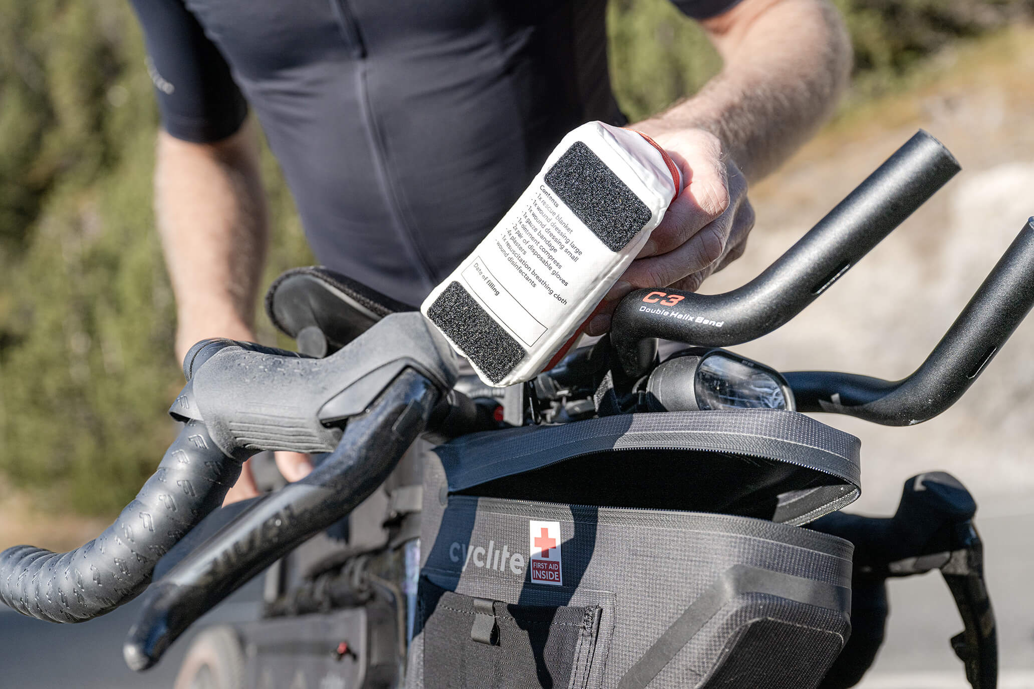FIRST AID KIT / 02 passt perfekt in alle CYCLITE Taschen und lässt sich im Tascheninneren per Klettverschluss platzsparend aufräumen. Damit das Set im Notfall von Helfern schnell gefunden werden kann, wird ein entsprechender Aufkleber für die Außenseite der Tasche mitgeliefert. FIRST AID KIT / 02 ist damit die perfekte Ergänzung zur Bikepackingausrüstung und sollte auf keiner Tour fehlen.