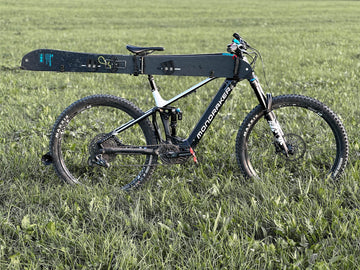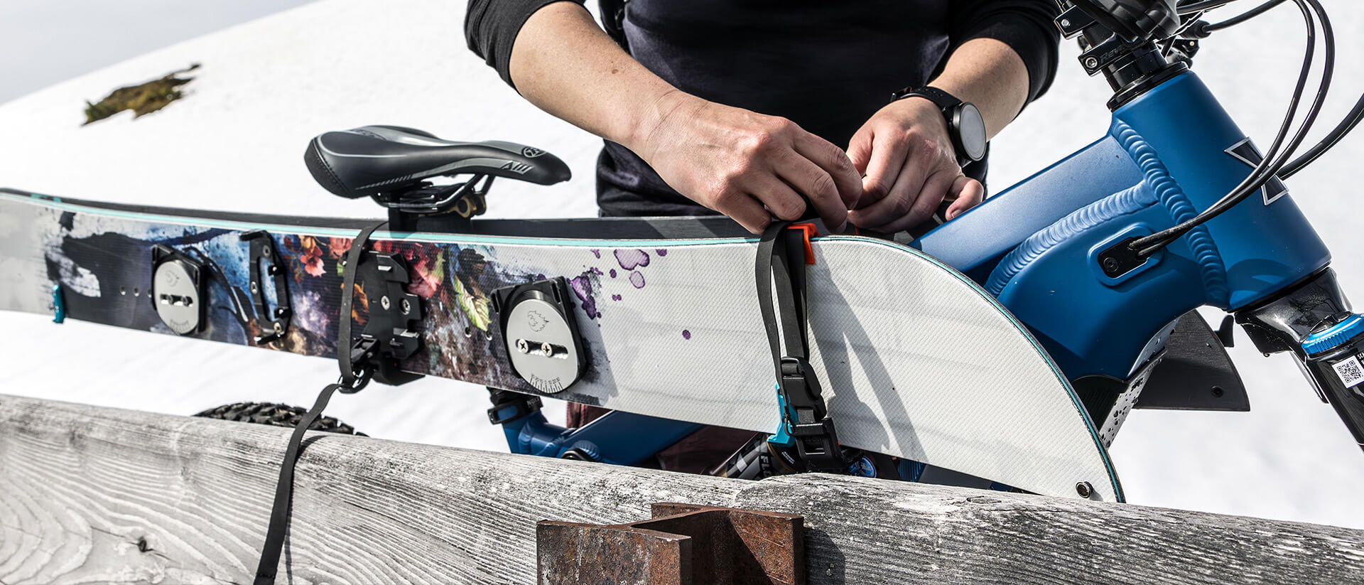 SKI RACK / 04 Die vierte Generation des SKI RACK ist jetzt noch robuster und nutzerfreundlicher und lässt sich dank Größenverstellung nun auch an E-Bikes mit sehr großen Oberrohren problemlos befestigen. Vom schlanken Langlaufski bis zum dicksten Freerider und sogar Splitboards lassen sich die Ski einfach und in wenigen Sekunden bombenfest am Rad befestigen, ohne dass sie beim Fahren merklich stören. Auch die Skistöcke finden in der Mitte ihren Platz. Mit dem Rad kommen wir schnell und unkompliziert zur höher liegenden Schneegrenze und auf die Bretter, wenn für die meisten die Saison schon längst beendet ist. Damit die Ski dabei schnell, unkompliziert und sicher ans Rad kommen, haben wir das SKI RACK entwickelt.